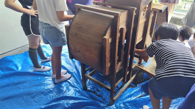 9月4日(木)に菜の花からできた菜種を使って、光ヶ丘小学校で菜種油搾りなどを実施しました