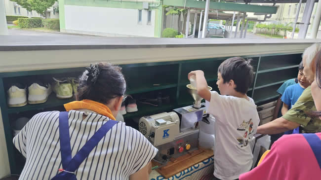 菜の花プロジェクトの一環として、小牧市女性の会が講師となり、光ヶ丘小学校の3年生に「とうみ・菜種油搾り・ドーナツ作り」を体験してもらいました。